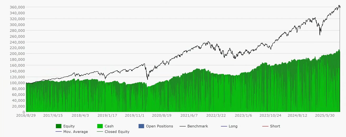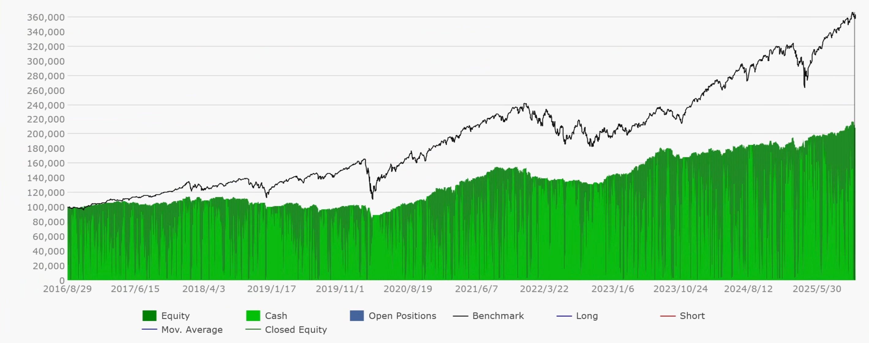 首先我们将策略应用到 NASDAQ 100 成分股,我们给每个买入信号分配 5% 的仓位,看看结果如何: