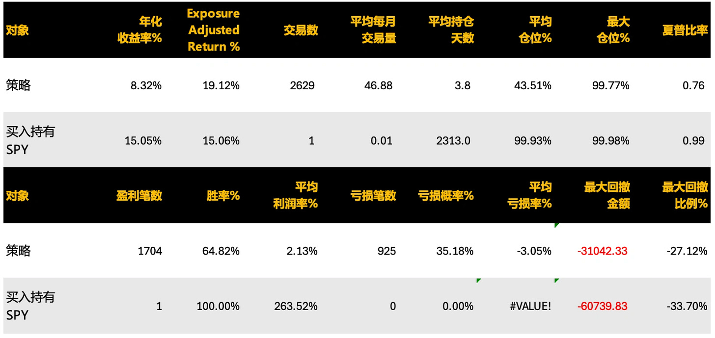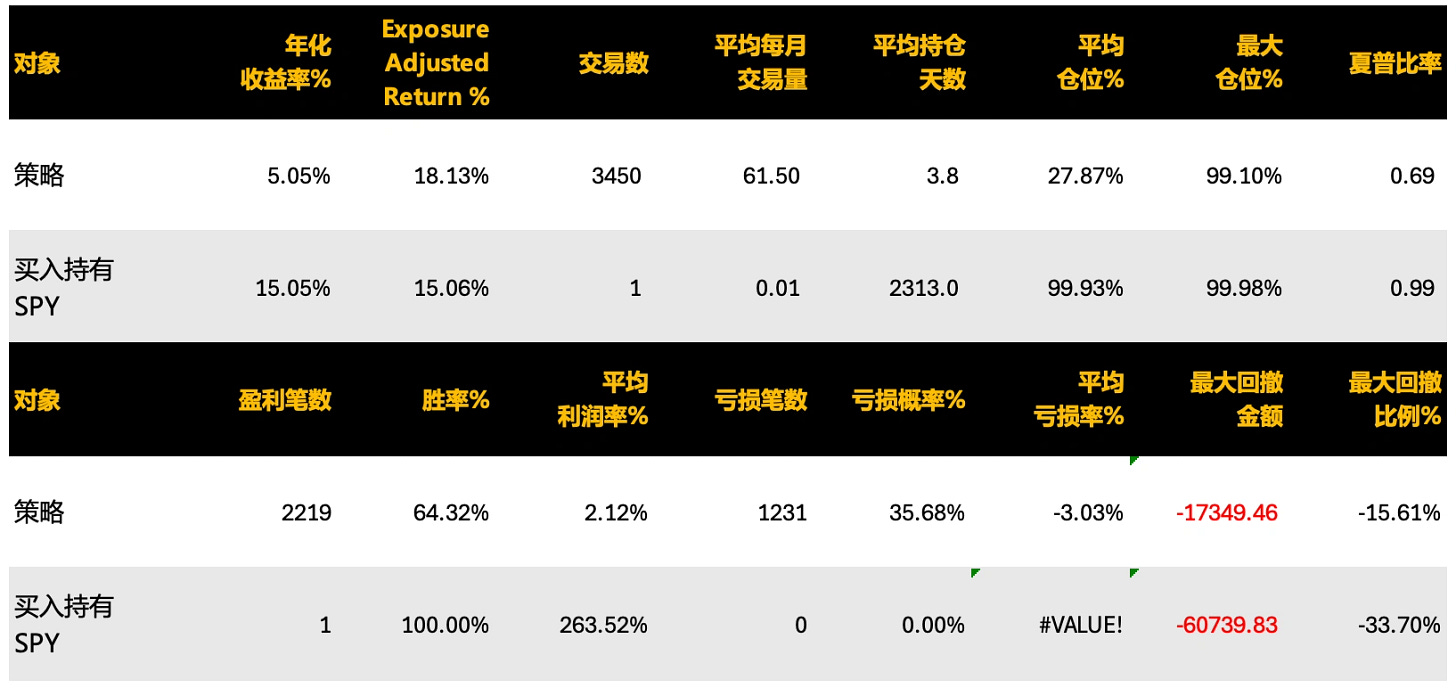 整个策略对仓位的使用不大,综合只有 27% 的仓位,从 EAR 来看,年化收益率略高于买入持有 SPY,但回撤幅度是显著超过买入持有 SPY 的。