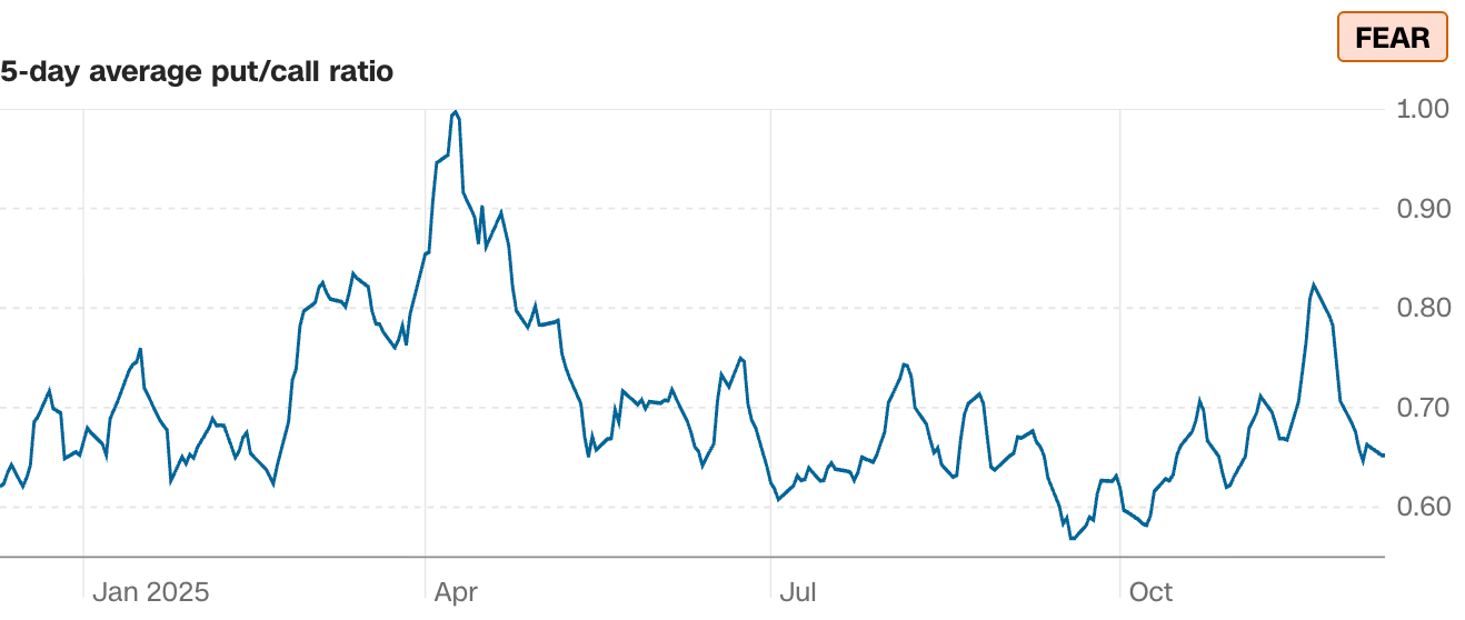 当 看跌期权/涨期权 比率上升时,通常是投资者变得更加紧张的迹象。比率高于 1 被认为是看跌的。恐惧与贪婪指数使用看跌期权比率作为恐惧的信号。