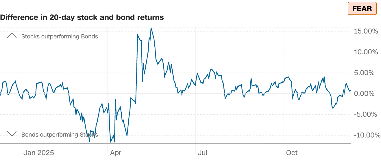 避险需求显示了过去 20 个交易日国债和股票收益的差异。当投资者感到害怕时,债券表现更好。恐惧与贪婪指数使用不断增加的避险需求作为恐惧的信号。