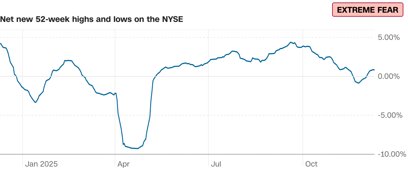 观察纽约证券交易所处于 52 周高点的股票数量与处于 52 周低点的股票数量。当高点多于低点时,这是一个看涨信号,表明贪婪。