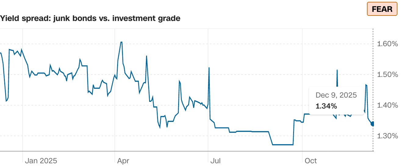垃圾债券和更安全的政府债券收益率之间的较小差异(或利差)表明投资者正在承担更多风险。更大的价差表明更谨慎。恐惧与贪婪指数将垃圾债券需求作为贪婪的信号。