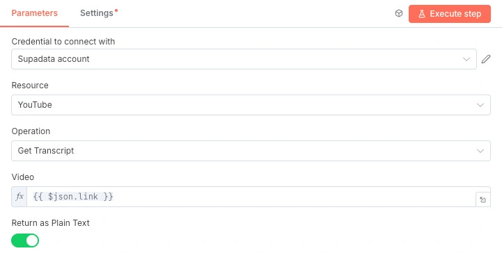 我使用的是 Supadata,它的优点是每月有免费额度,可以抓取 100 条视频字幕,基本可以满足日常用量了,同时官方提供 n8n 节点,配置起来也比较方便: