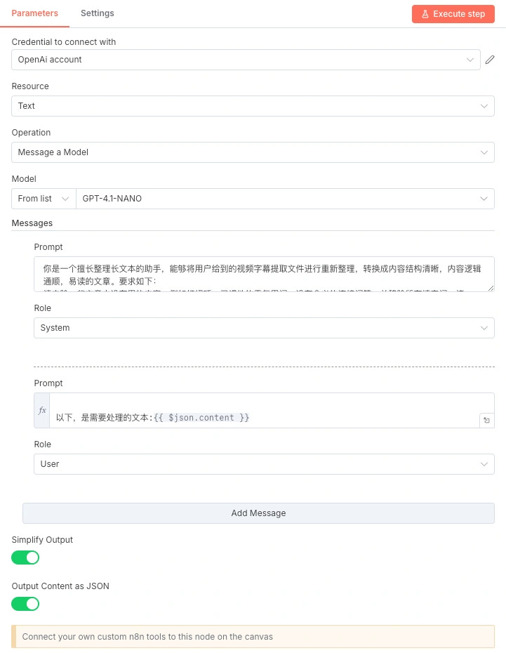 下一步我们将抓取的字幕文件投喂给 AI 进行总结,n8n 集成了大量语言模型,你可以选择最喜欢的。