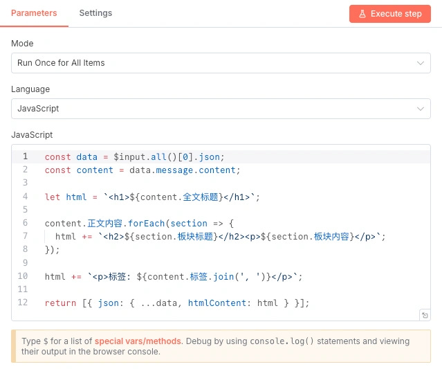 接下来我们使用一个“Code”节点来将语言模型输出的内容转化成 html 格式,实现区分大标题,小标题,板块内容和标签等内容。当然你也可以根据喜好来进行格式设置。