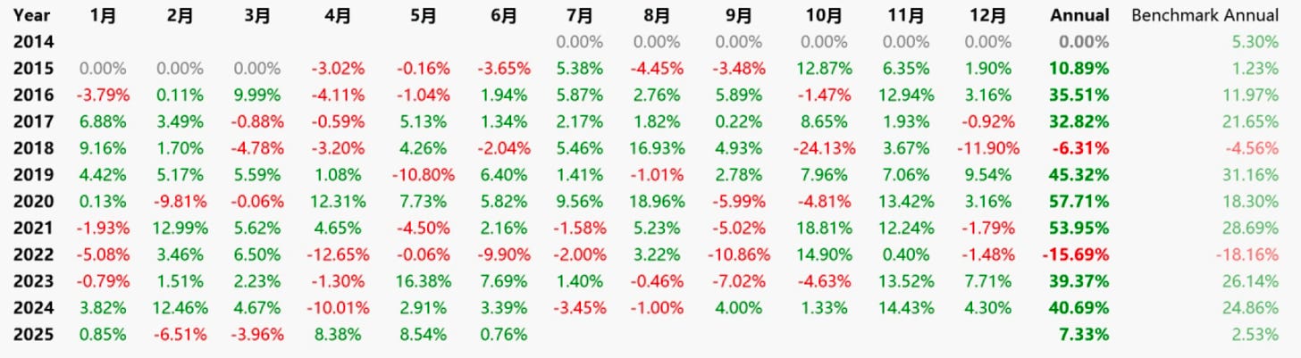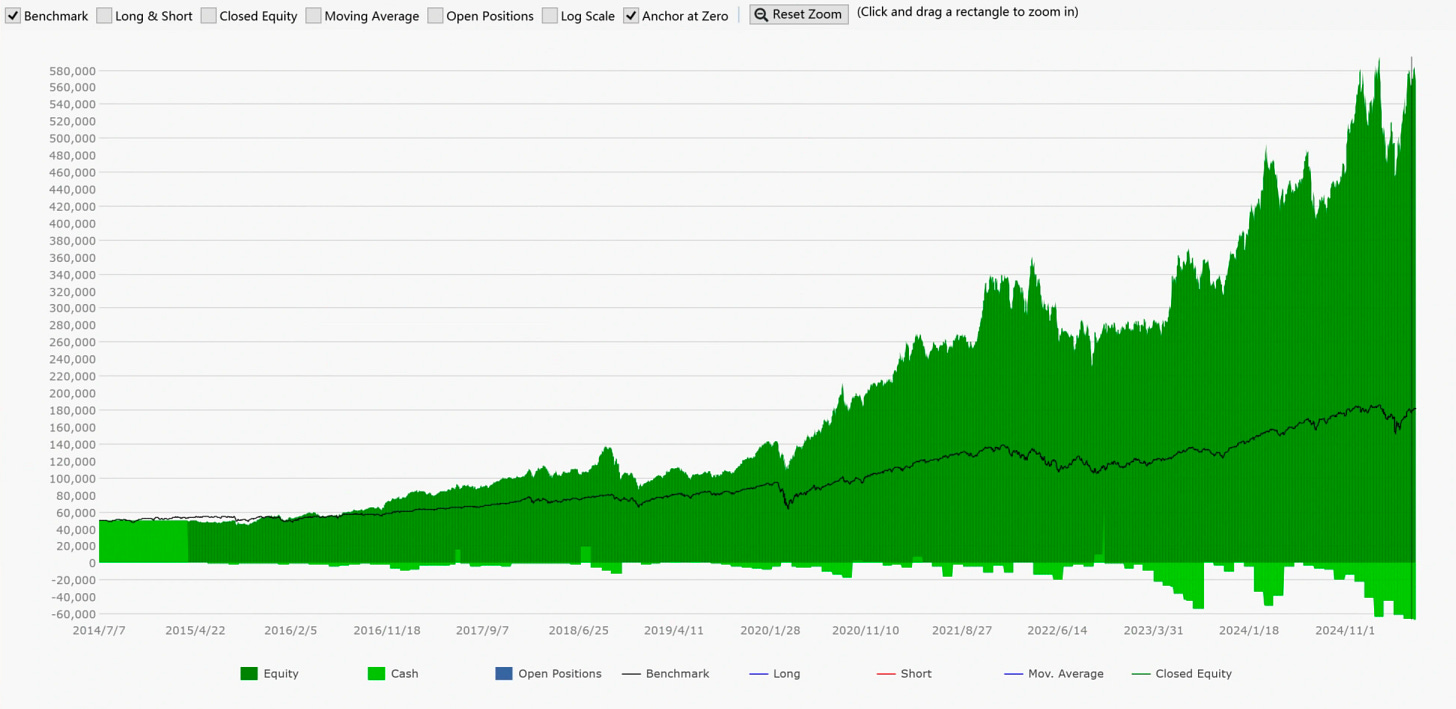 于是,我们假设:如果挑选出核心股票,组成一个“SPY 强化版”是否就能获得更好的表现呢?基于这个假设我构建了一个非常简单的轮换策略,以下是他在过去 10 年的回测表现,10 年共获得了 1070% 的收益,APR 年化收益为 25.28%,最大回撤 38.59%