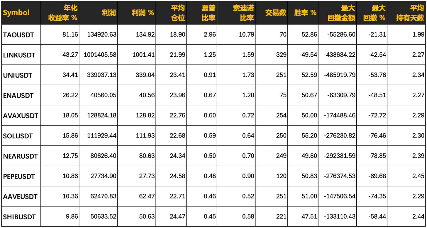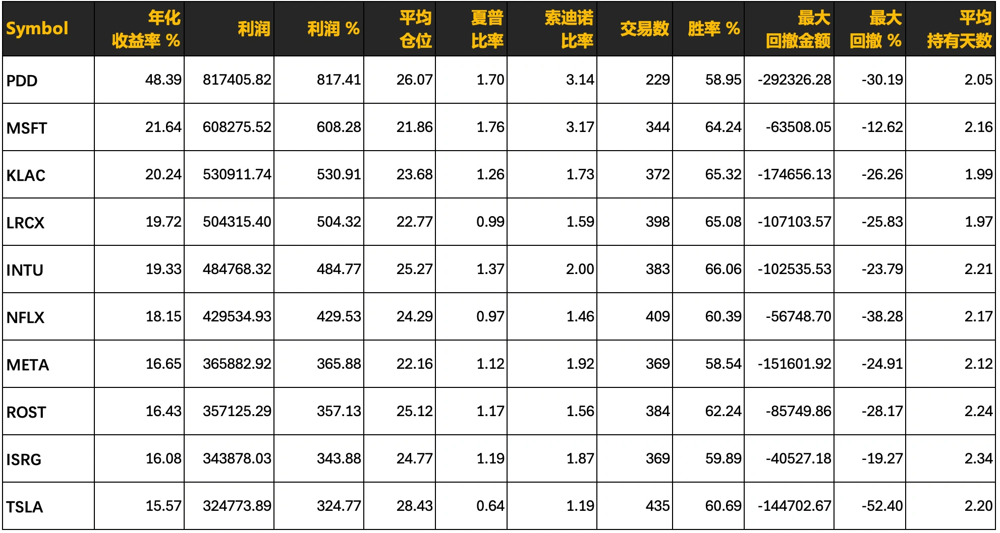接下来,我们也试试将这个策略应用在个股上面,我们把纳斯达克 100 的成分股都跑一遍,截取里面前十名数据分享给大家,第一名绝对出乎意料: