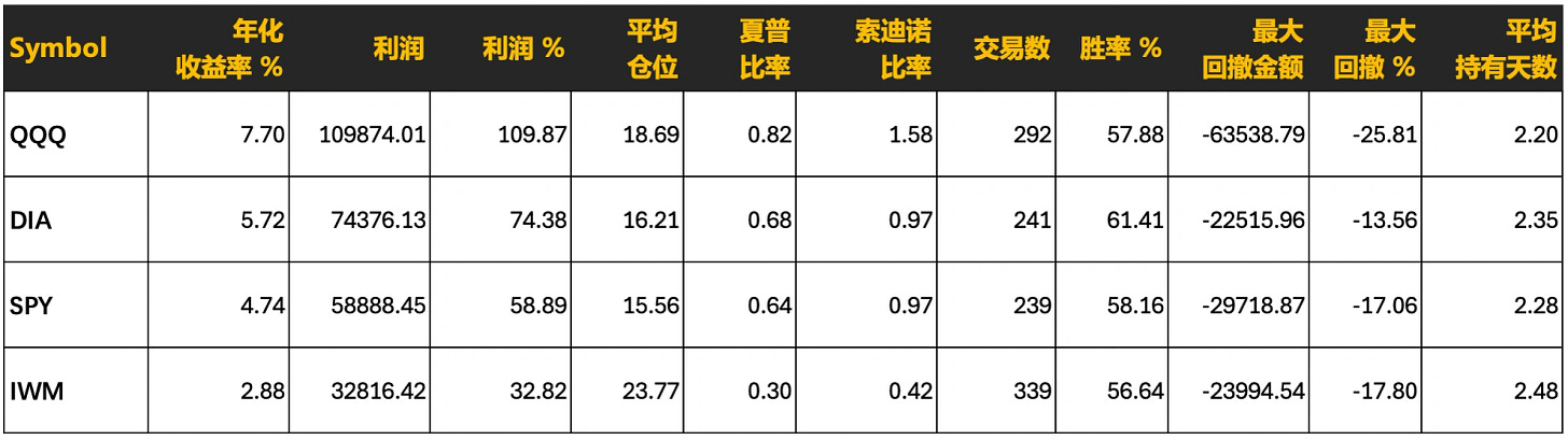 我们可以看到当应用在 3 大指数时,收益最高的就是波动性最高的 QQQ,而 DIA 和 SPY 的结果非常相近。