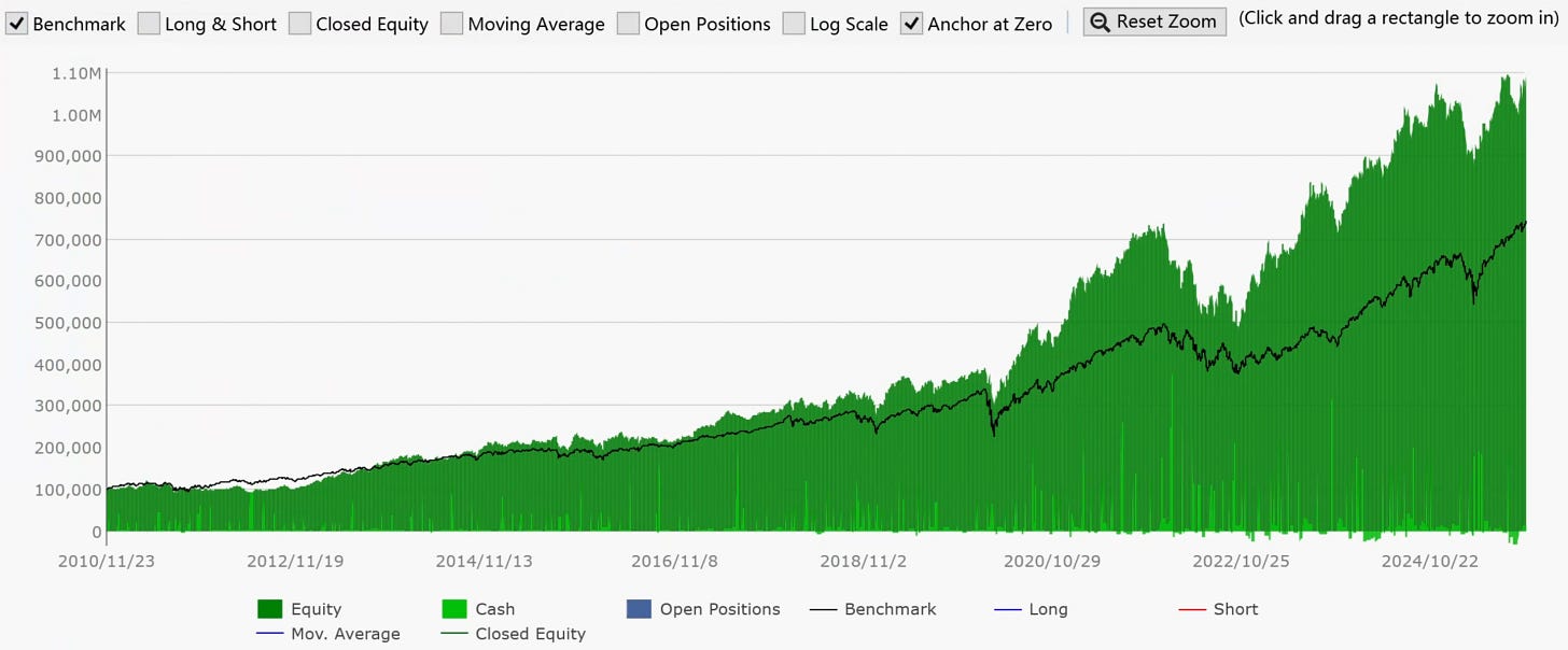 而我们对策略进行优化后,他的表现数据也战胜了买入持有 SPY。