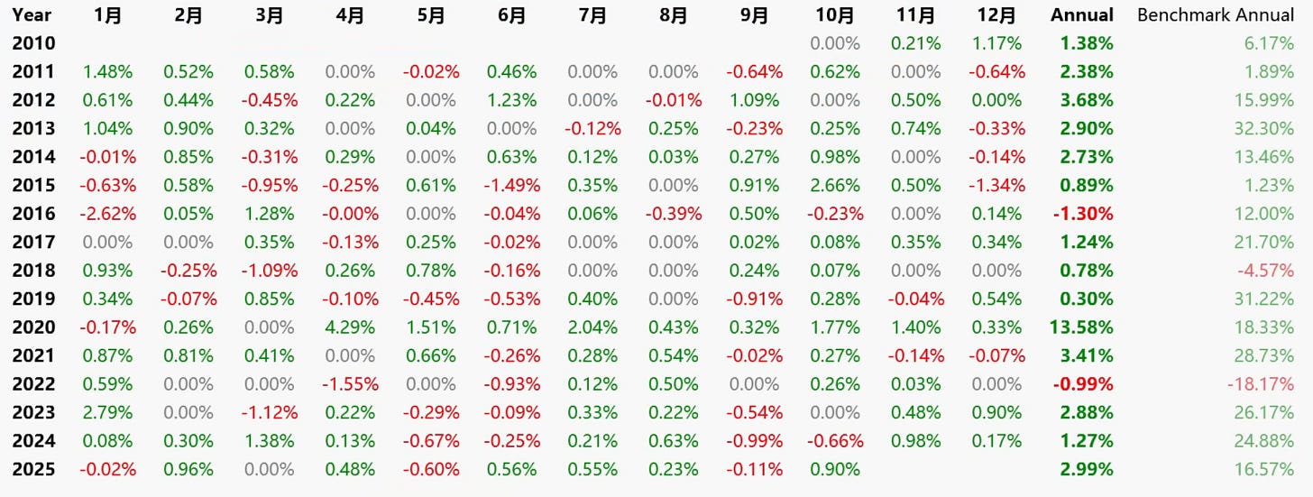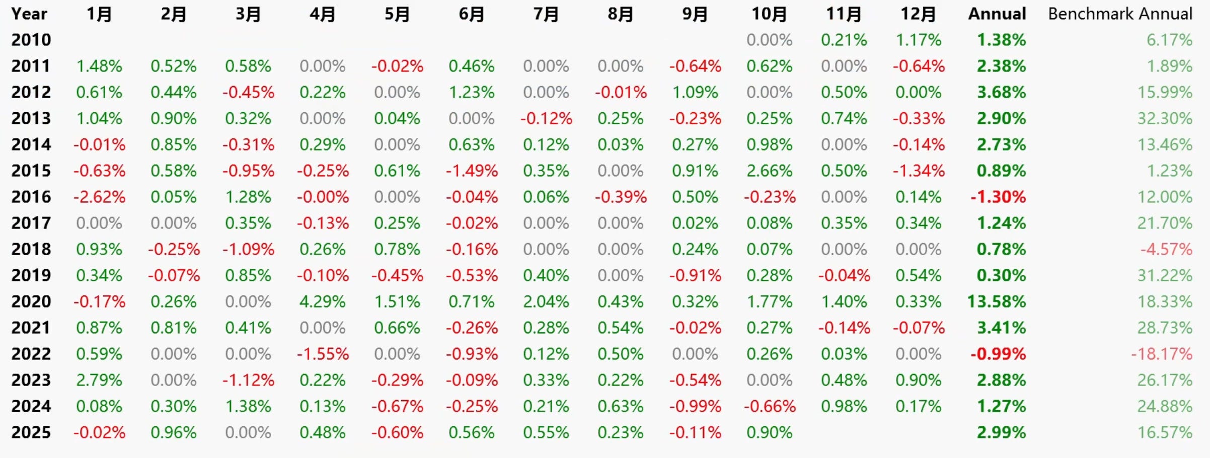 该策略在 4 大指数上表现出了很高的胜率,同时非常好的控制住了回撤。通过下图我们可以看到该策略在过往的 15 年中,只有 2 年是亏存的,其他所有年度均保持盈利。