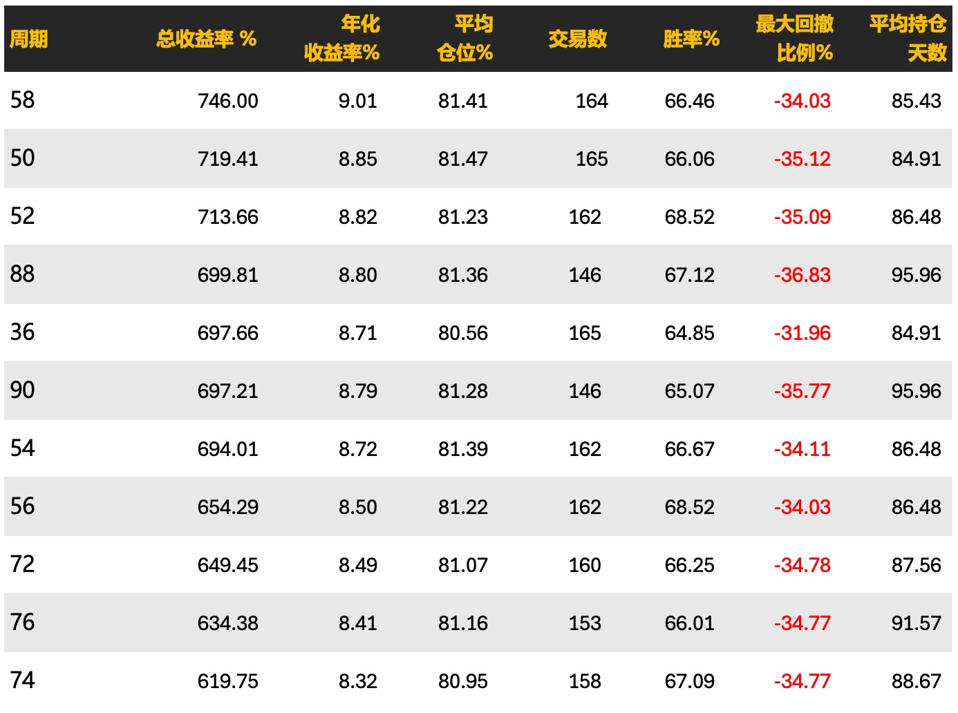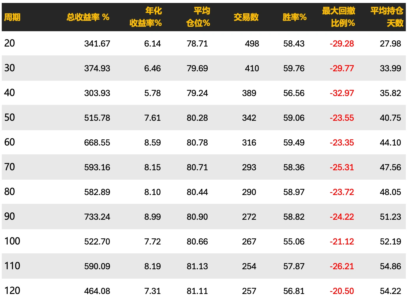 交易数随着回望周期的增加有明显的下降趋势,平均持仓天数则有上升趋势,这在数学上非常好理解。