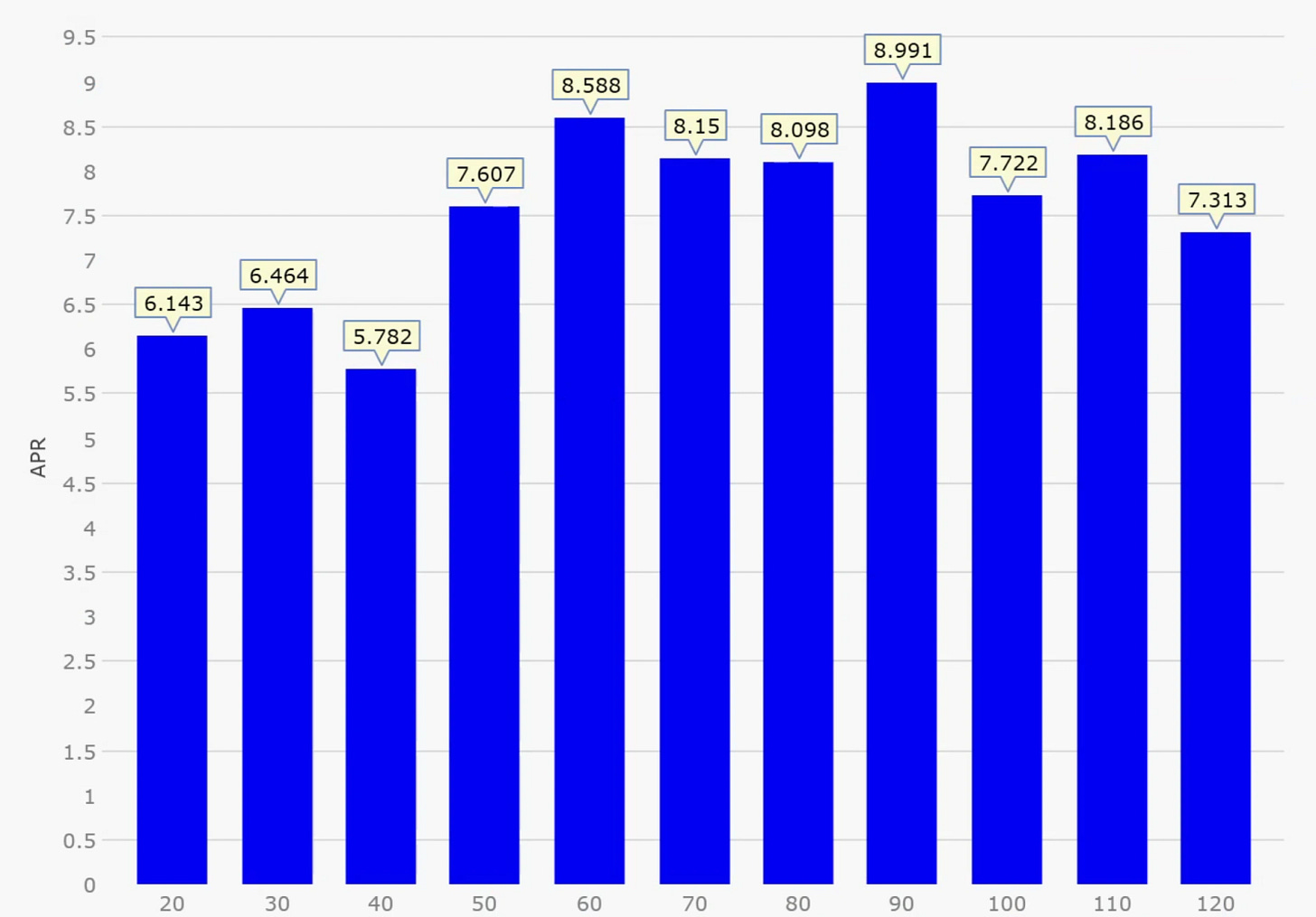 年化收益率随着回望周期的增加有微弱的上升趋势,最高收益率参数为 90 天,以下是年化收益率与回望周期天数形成的柱状图。