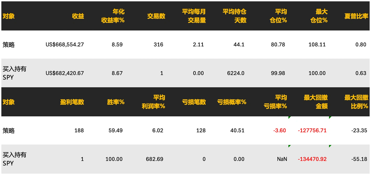 上图可以看到具体数据,年化回报略低于买入持有 SPY,回撤大约是 SPY 的一半。