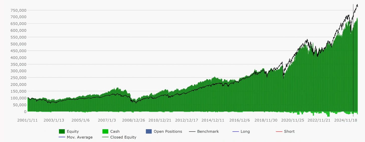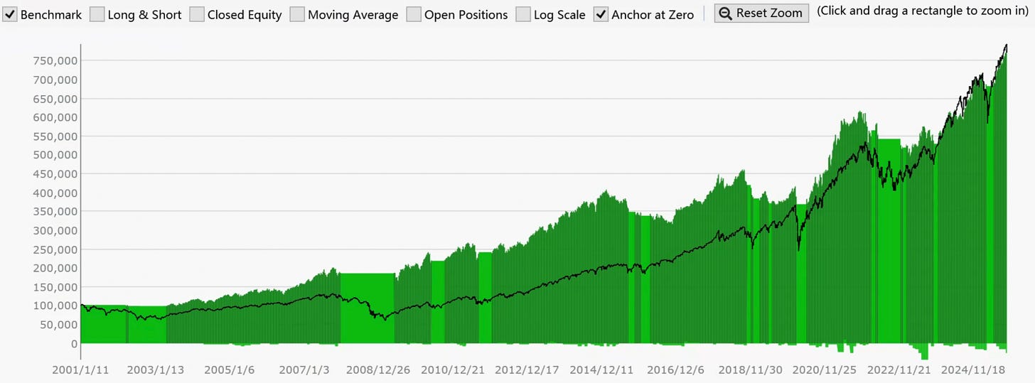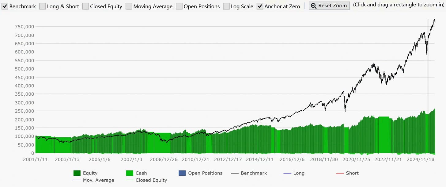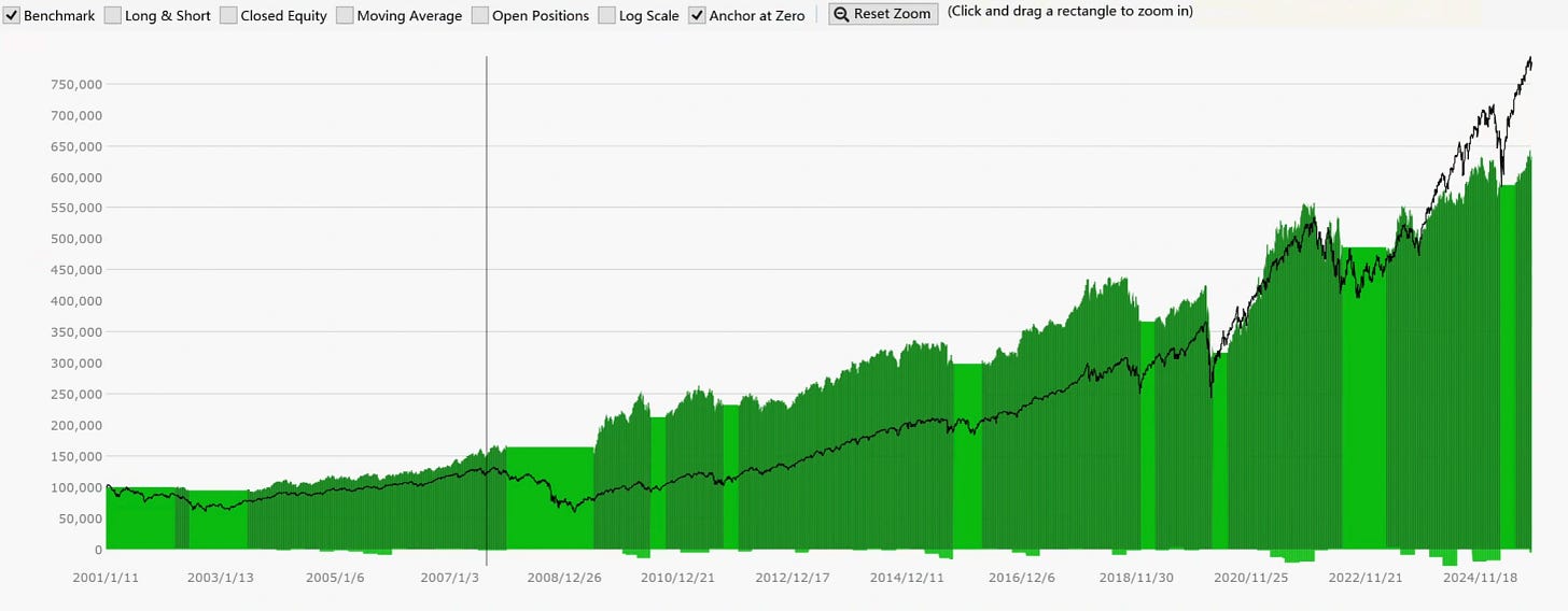 上图体现了这个策略在过去 25 年的表现,绿色块是策略收益,黑色线是买入持有 SPY 的表现。可以看到,在策略开始前几年表现是超出 SPY 的,主要由于 SMA(200) 设置让我们躲过了一个巨大的回撤,建立了先期优势,但之后 SPY(黑色线)表现奋起直追,在近几年追平策略。
