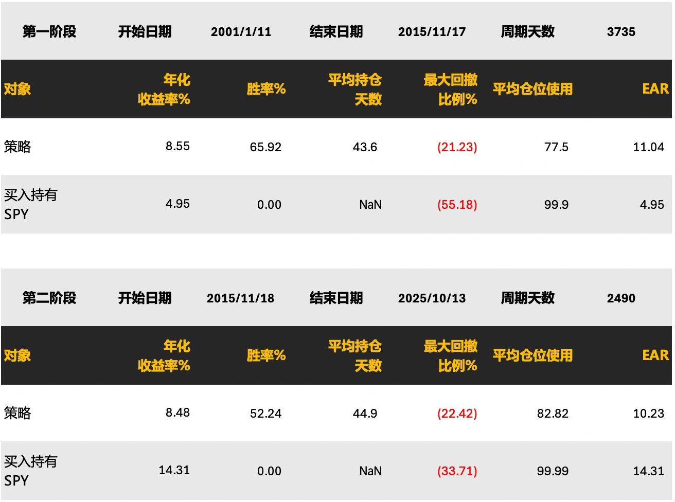 但是策略在近几年的表现显然不如买入持有 SPY,因此我们将整个测试周期的数据划分为 2 个阶段。来进行对比。